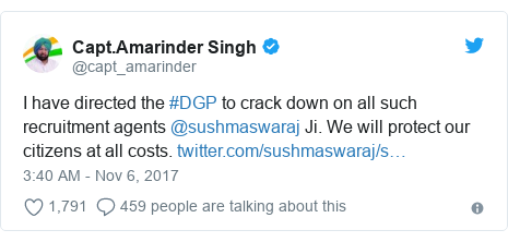 ਇਸ ਸਬੰਧ ਵਿੱਚ ਵਿਦੇਸ਼ ਮੰਤਰੀ ਸੁਸ਼ਮਾ ਸਵਰਾਜ ਨੇ ਟਵੀਟ ਕੀਤਾ,"ਮੈਂ ਕੈਪਟਨ ਅਮਰਿੰਦਰ ਸਿੰਘ ਨੂੰ ਧੋਖਾਧੜੀ ਅਤੇ ਗੁੰਮਰਾਹ ਕਰਨ ਵਾਲੇ ਏਜੰਟਾਂ ਖ਼ਿਲਾਫ਼ ਕਾਰਵਾਈ ਕਰਨ ਅਤੇ ਫ਼ੌਜਦਾਰੀ ਕੇਸ ਦਰਜ ਕਰਨ ਦੀ ਬੇਨਤੀ ਕੀਤੀ ਹੈ।"